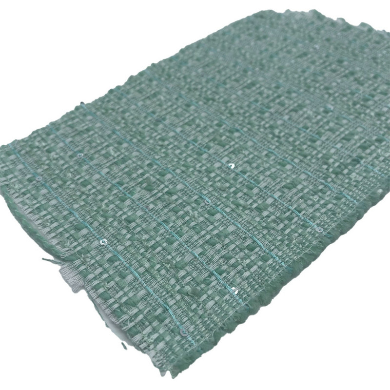 Loại vải này, được chỉ định là điều 22102, là loại vải dệt tweed jacquard bao gồm 90% polyester và 10% len. Với khối lượng trên một đơn vị diện tích là 320 gsm, nó có kết cấu nhẹ phù hợp với trang phục. Nền màu xanh nhạt có hoa văn nổi, trong đó các hạt sequin được tích hợp trong quá trình dệt để tạo ra các vùng phản chiếu cục bộ. Hàm lượng polyester cao đảm bảo độ ổn định kích thước và giữ hình dạng, trong khi thành phần len góp phần tạo nên đặc tính xúc giác của vải. Sự kết hợp này tạo ra vật liệu có sự thay đổi kết cấu bề mặt và tính nhất quán về cấu trúc. Những đặc tính kỹ thuật này làm cho loại vải tuýt jacquard này có thể áp dụng cho những chiếc váy đòi hỏi phải có bề mặt trang trí và cấu trúc trang phục.